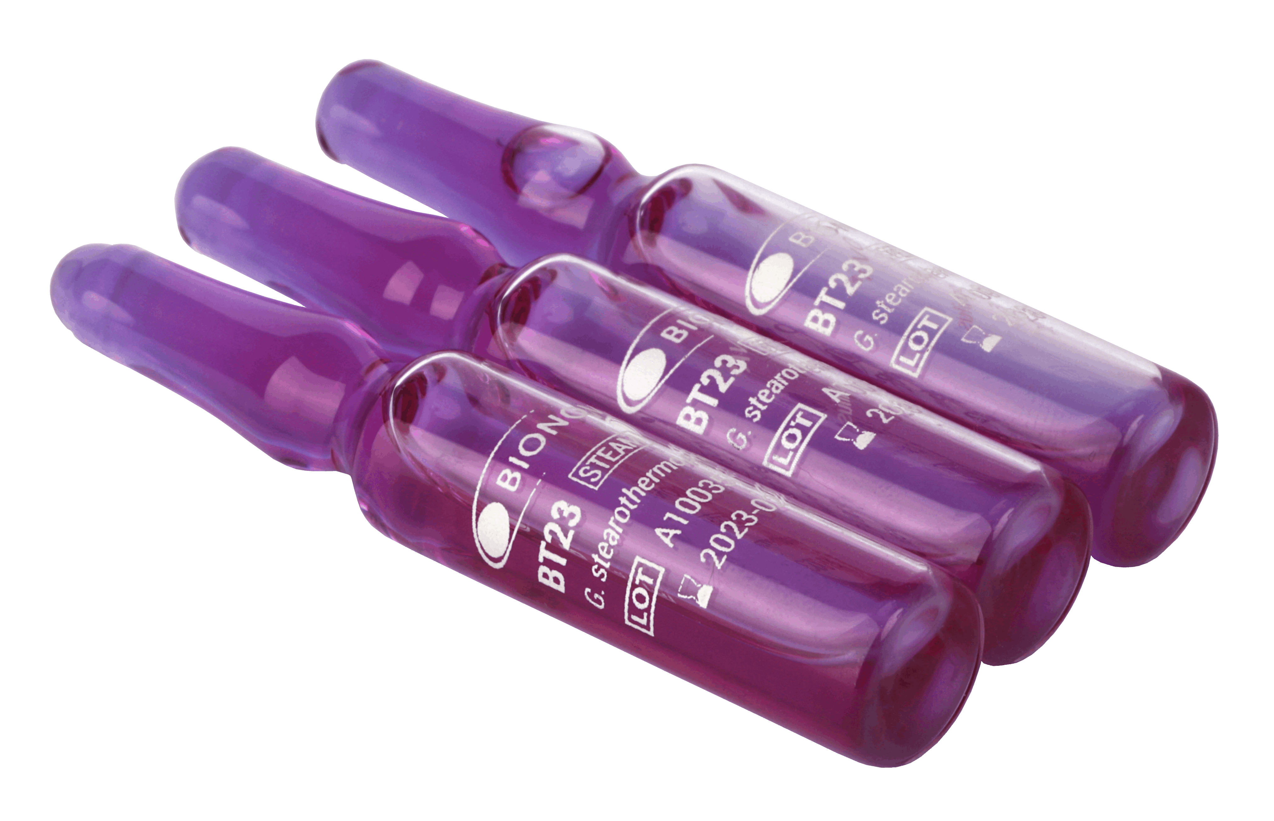 Один из наиболее распространенных индикаторов для контроля паровой стерилизации — BT23. Внутри него находятся споры Geobacillus stearothermophilus — микроорганизма, признанного эталоном устойчивости к насыщенному пару.